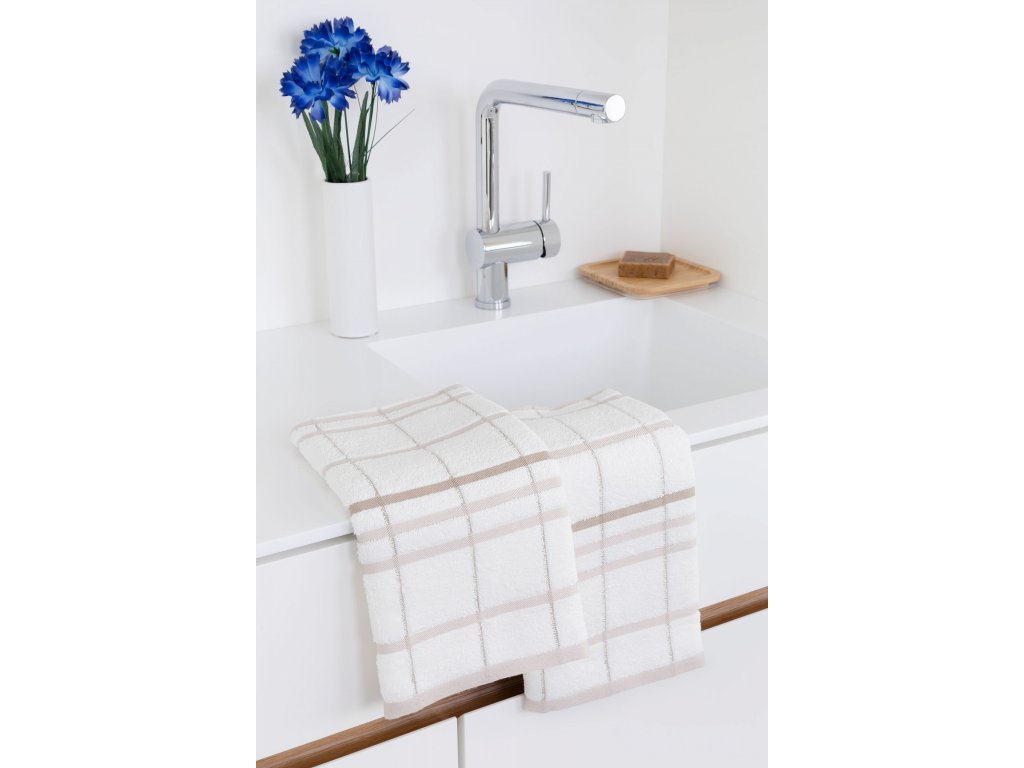 Kuchynské utierky Megan zdobia elegantný kockovaný motív vo farebne zladených tónoch, ktorý je vďaka vtkanej štruktúre viditeľný z oboch strán slučkového froté. Utierky sú navrhnuté tak, aby mali ideálne absorpčné vlastnosti a súčasne rýchlo schli. Utierky sú zo všetkých štyroch strán lemované a sú opatrené praktickým pútkom.