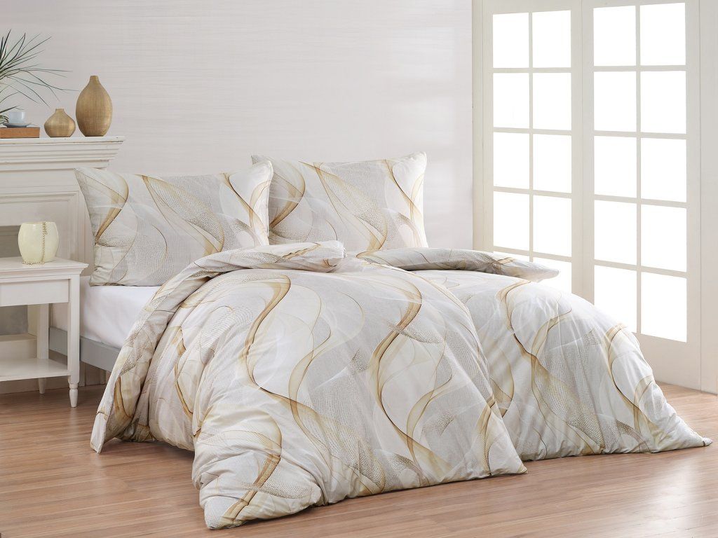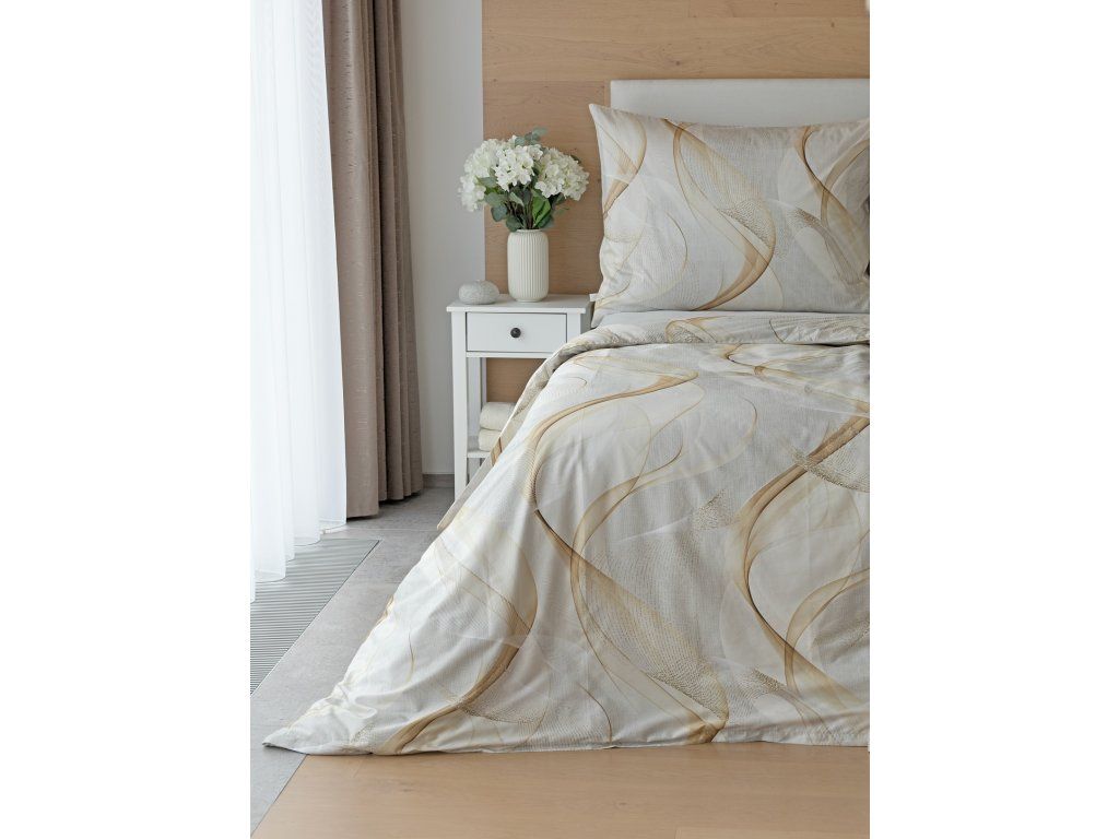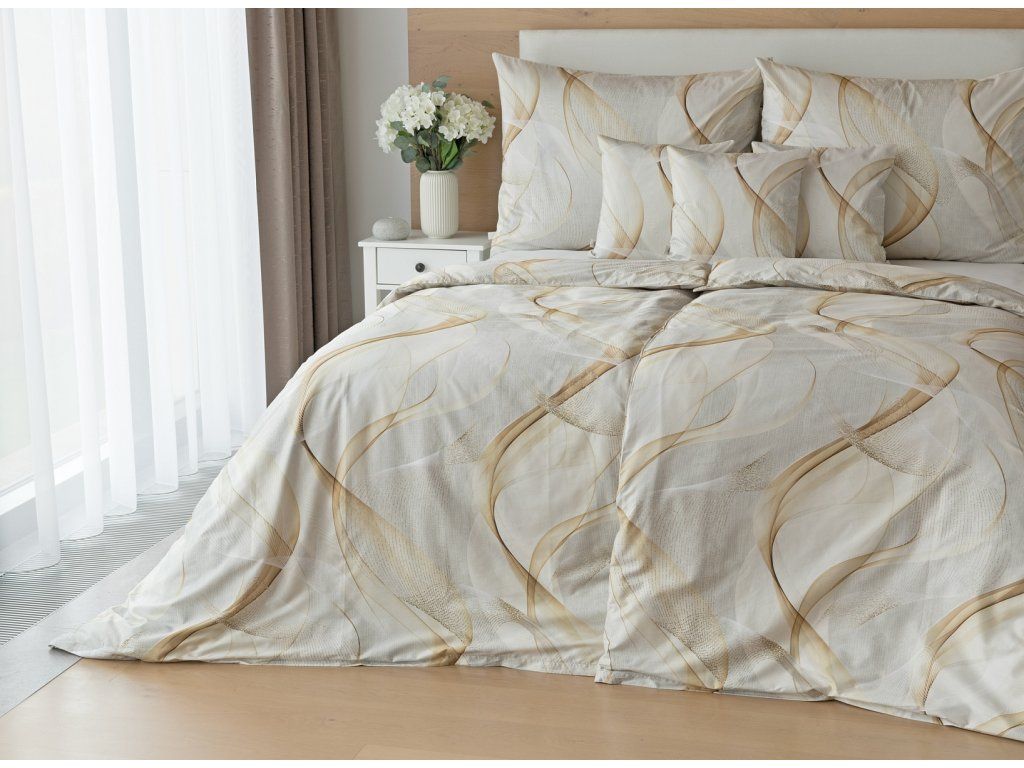 Obliečky Delight zdobia jemný geometrický vzor v podobe bielych a zlatistých nepravidelných vlniek na svetlo šedom podklade.